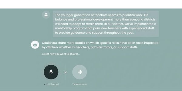 Our AI-Moderated Interviews capture authentic voice feedback—staff, student, or parent—without the scheduling, facilitation, or manual analysis. Participants respond in their own time, by voice. The AI moderator listens, asks follow-up questions in real time, and digs deeper like a skilled facilitator would. Themes are instantly summarized and delivered straight to your portal.